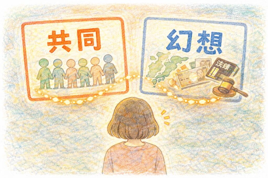 『共同幻想』は、思想・社会論・経済のたとえ・現代哲学との比較など、文脈によって見え方が少し変わる言葉です。したがって、ここでの説明が唯一絶対の正解というわけではありません。