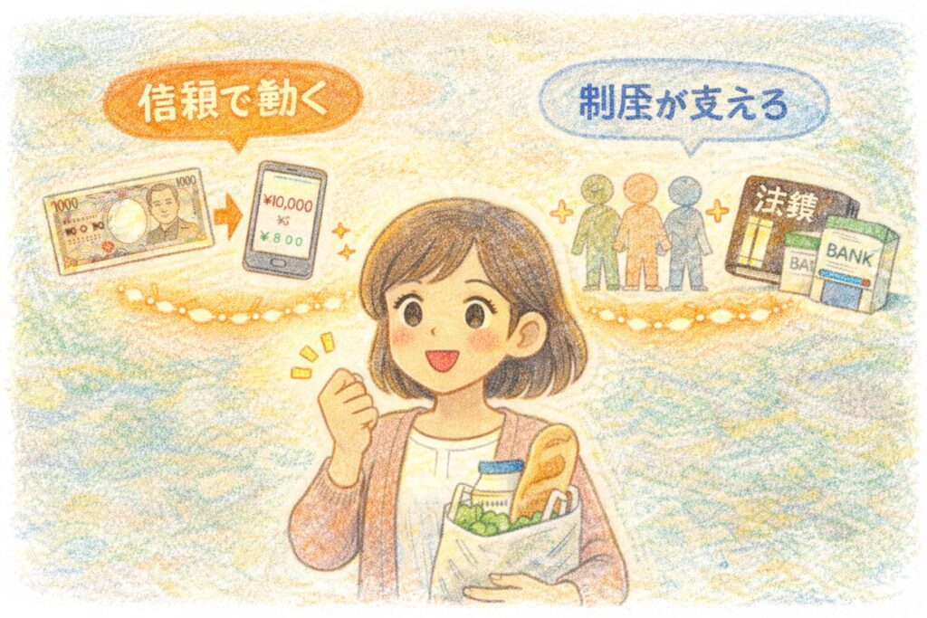 つまり、お金は「みんなが何となく信じているだけ」の存在ではなく、共有された信頼+価値を守る仕組み+法的な支えによって成り立っているのです。