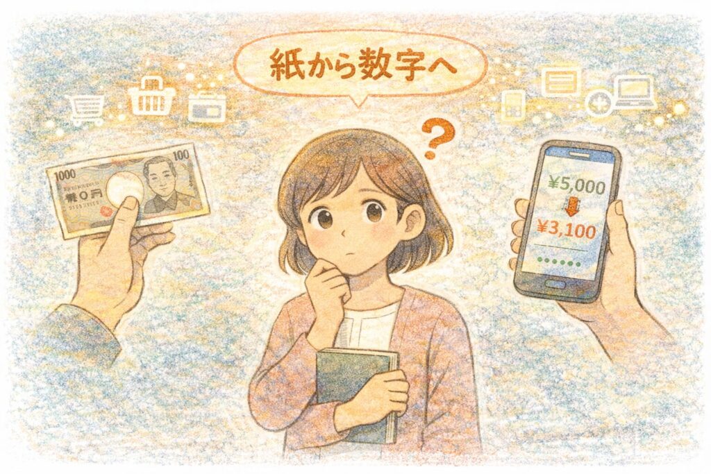 「紙ならまだしも、数字だけでも買い物ができるのは、どうしてなんだろう」