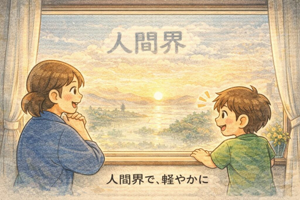 そして「人間」という言葉は、もともと **“人が住む世界(人間界)”**という意味から始まって、そこから **“人(ひと)”**の意味にも広がった――そう整理すると、胸の中のモヤモヤがすっとほどけました。