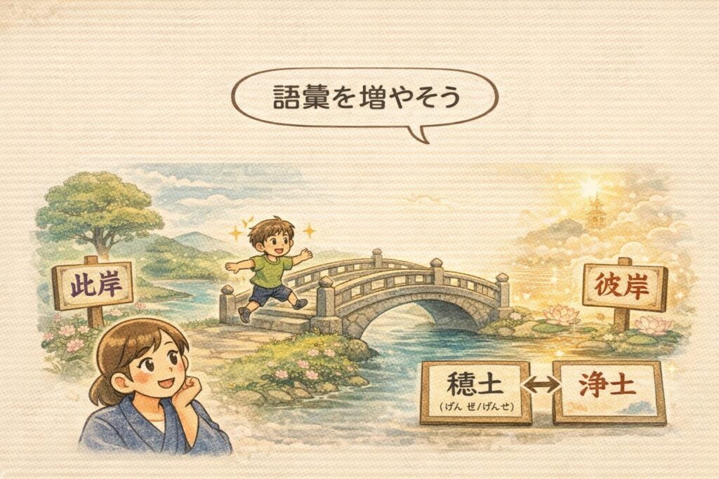 - 彼岸(ひがん):悟りの世界/理想の境地(川の向こう岸のたとえ)