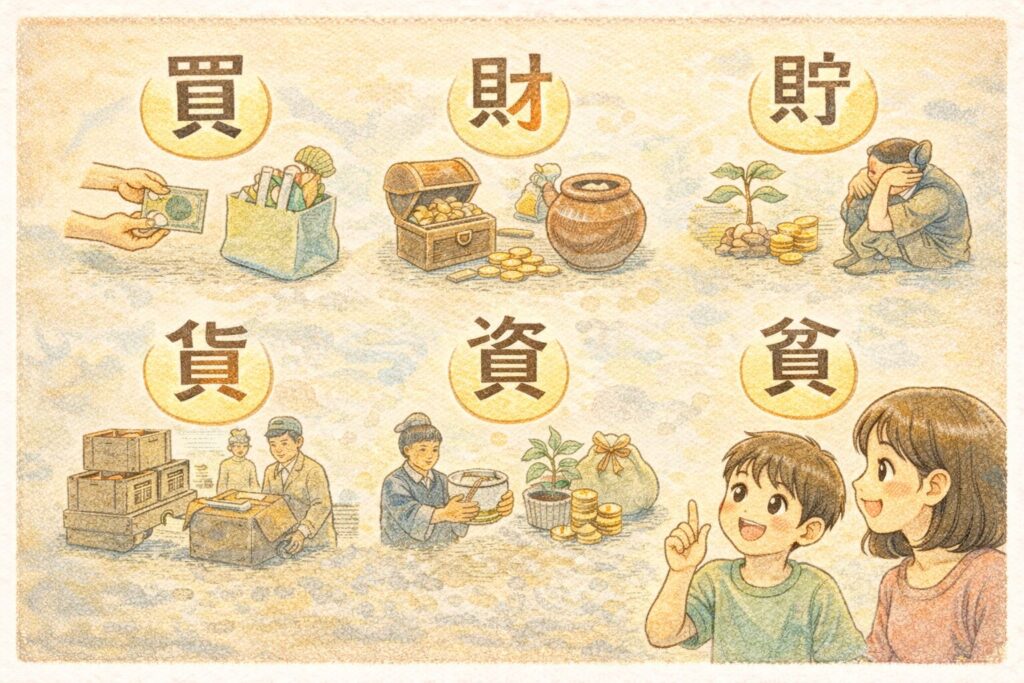 実際、一般向けの解説でも、お金や経済に関係する漢字には「貝」が多いことはよく取り上げられています。山梨中央銀行の子ども向け資料でも、財・貯・買・貸・貨・販・資・購などが例として挙げられています。