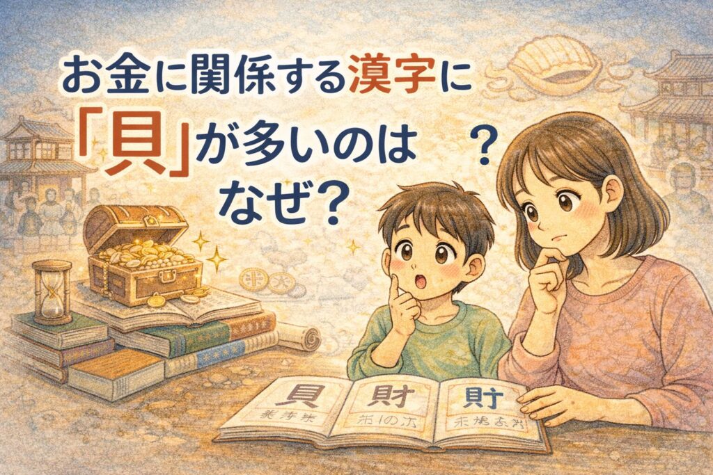 お金に関係する漢字に『貝』が多いのは、古代中国で貝が貨幣や価値ある品として使われ、その名残が漢字に残ったからです。
