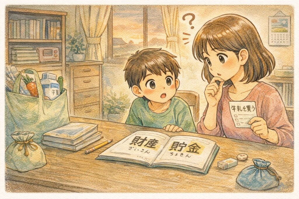 ドリルには「財産」「貯金」。