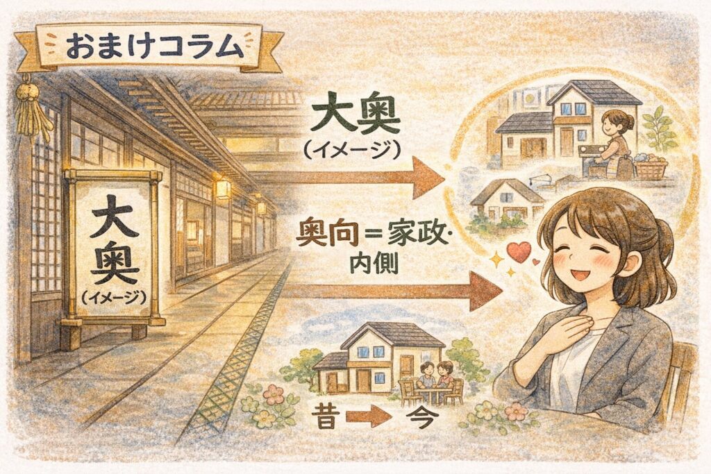 - 奥向(おくむき):家の奥・家政(暮らしの内側)の方面