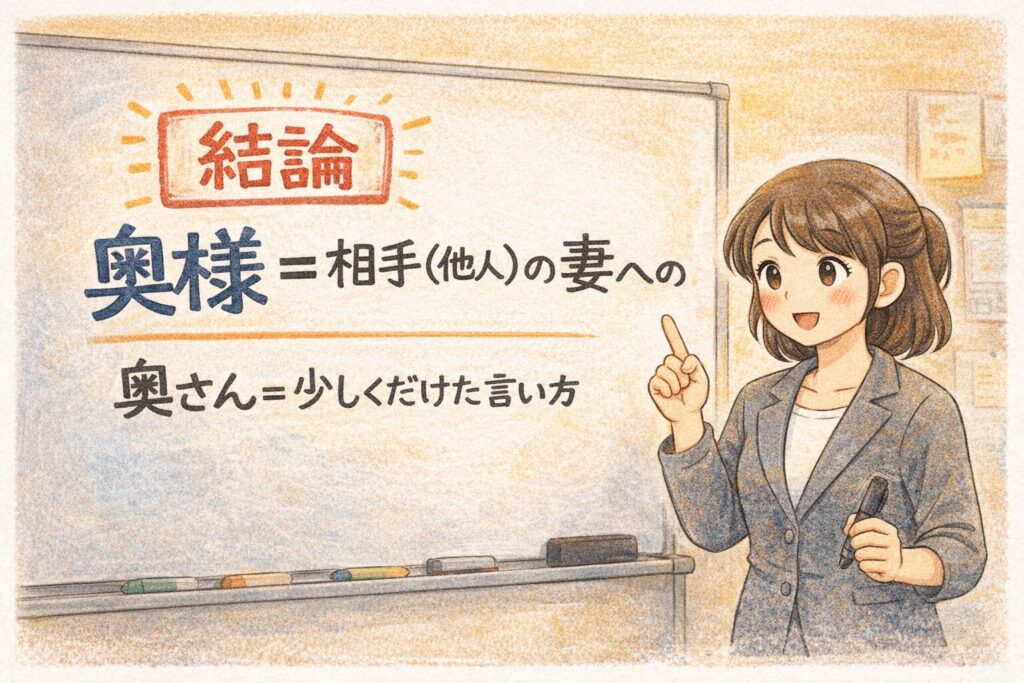 ここまでで、「奥様」「奥さん」が“相手に使う敬称”寄りだと分かってきたはずです。