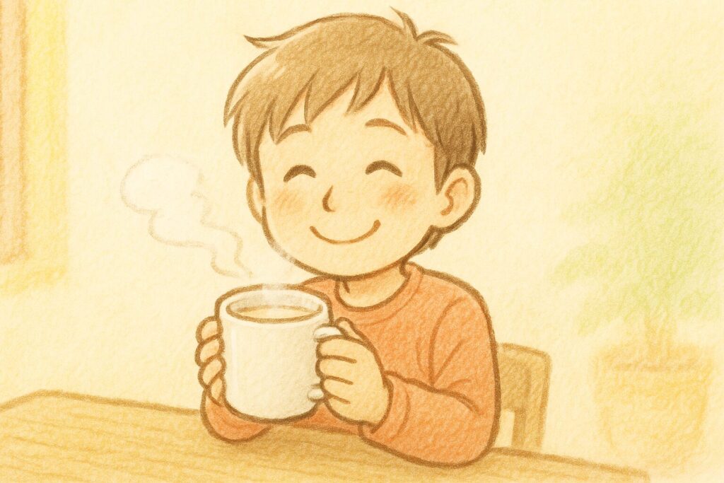 ある日の朝。ユウタくんは、昨日と同じようにホットミルクを作りました。