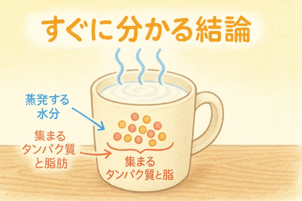 温めると、水分だけが空気中に逃げていき、残ったタンパク質や脂肪が表面に集まります。