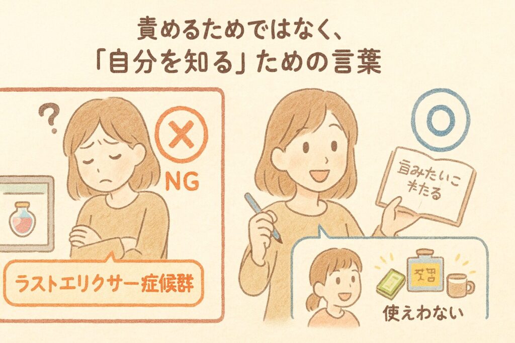 「ラストエリクサー症候群」という切り口から、自分の行動や価値観を見直すための入り口として書かれています。