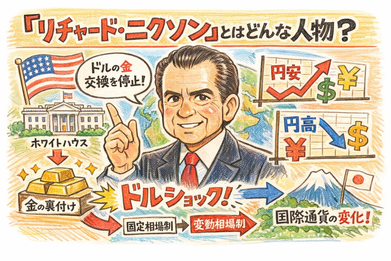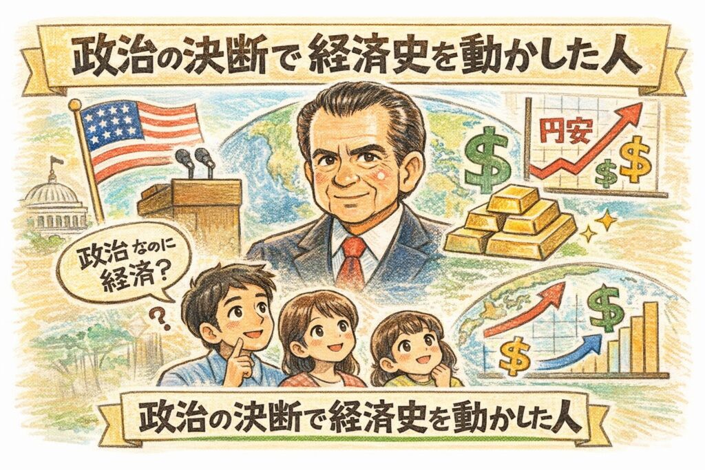『リチャード・ニクソン』とはどんな人物だったのかを、『ニクソン・ショック』の意味、戦後の国際通貨体制、円安・円高とのつながりまで初心者向けにやさしく解説します