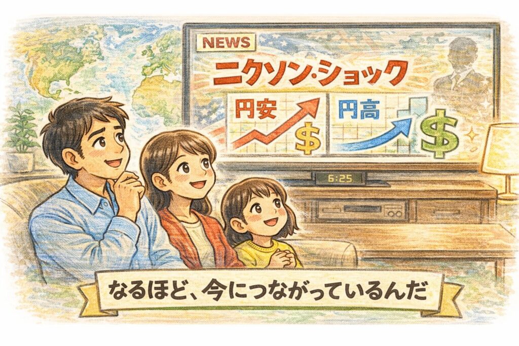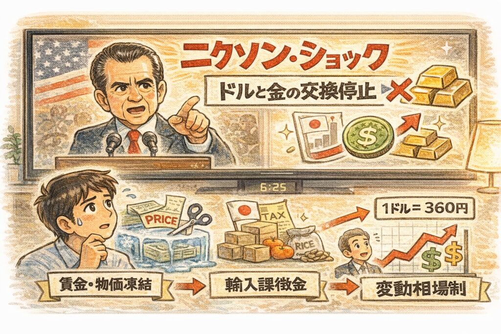 この出来事はニクソン・ショックと呼ばれ、その後の固定相場制の揺らぎや、主要通貨の変動相場制への流れにつながりました。