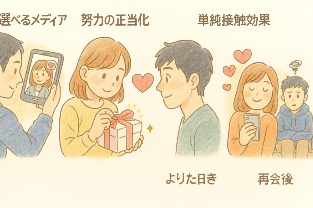 単純接触効果(見る回数・触れる回数が増えるほど好意が増す)も一役買います。対面は減っても、日々のメッセージや通話が増えれば、接触の総量はむしろ増える。これが親密感の底上げに効くことがあります。