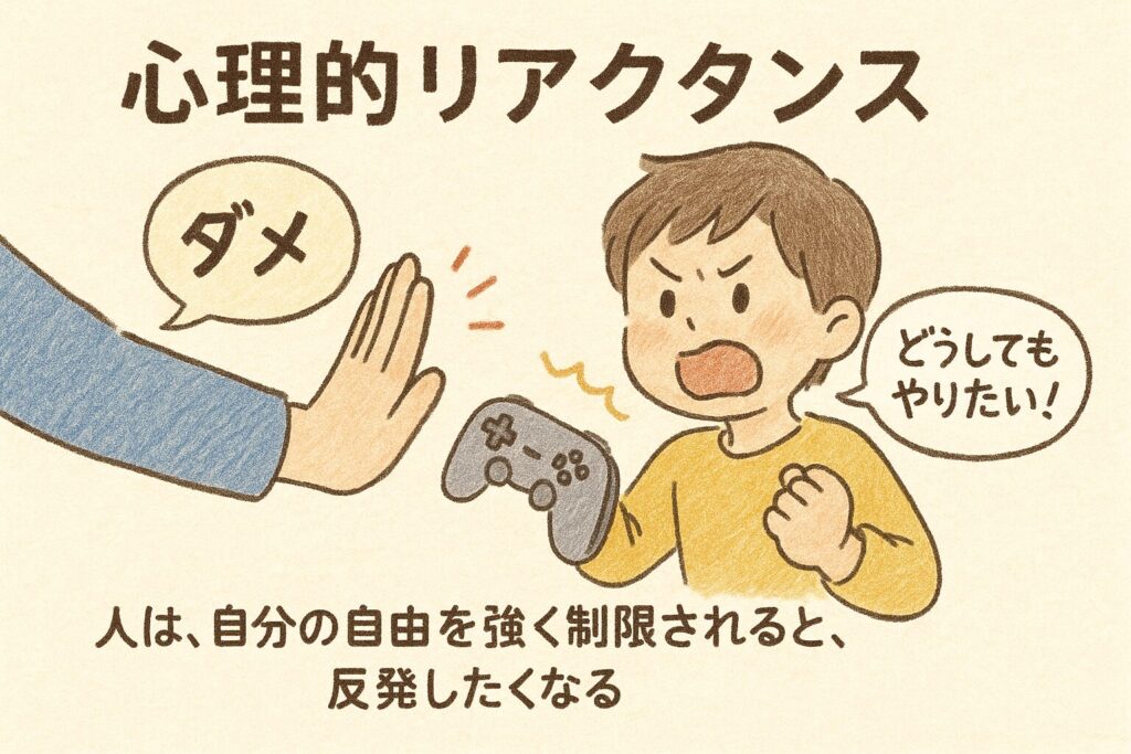 ところが、その自由を「ダメ」「やめて」と強く制限されると、心の中で反発する力が生まれます。心理学では、これを心理的リアクタンスと呼びます。