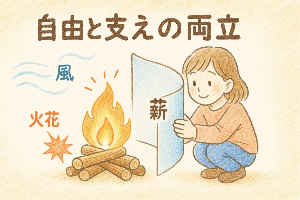 恋愛を育てるうえで重要なのは、炎を大切に育てる環境を整えることです。禁止や強圧は、風のように火を揺らし、時には吹き消してしまいます。一方で、自由を尊重しつつ、建設的な助言を与える態度は、ちょうど風よけのように炎を守ります。その関わり方が、本人の成長と周囲の安心を両立させる「関係の自治」につながるのです。