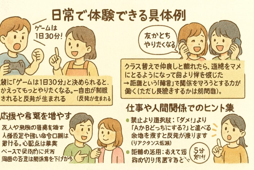 A. 禁止されるほどやりたくなる反応(リアクタンス)は勉強・仕事でも起こります。設計は「選択肢と自律」が基本です。