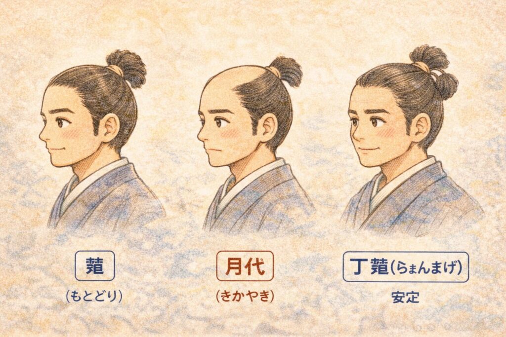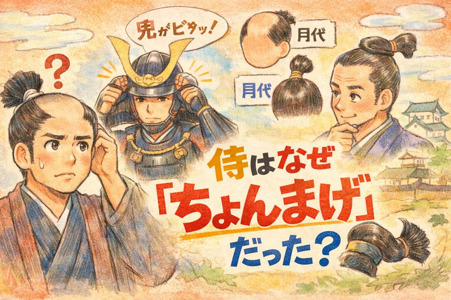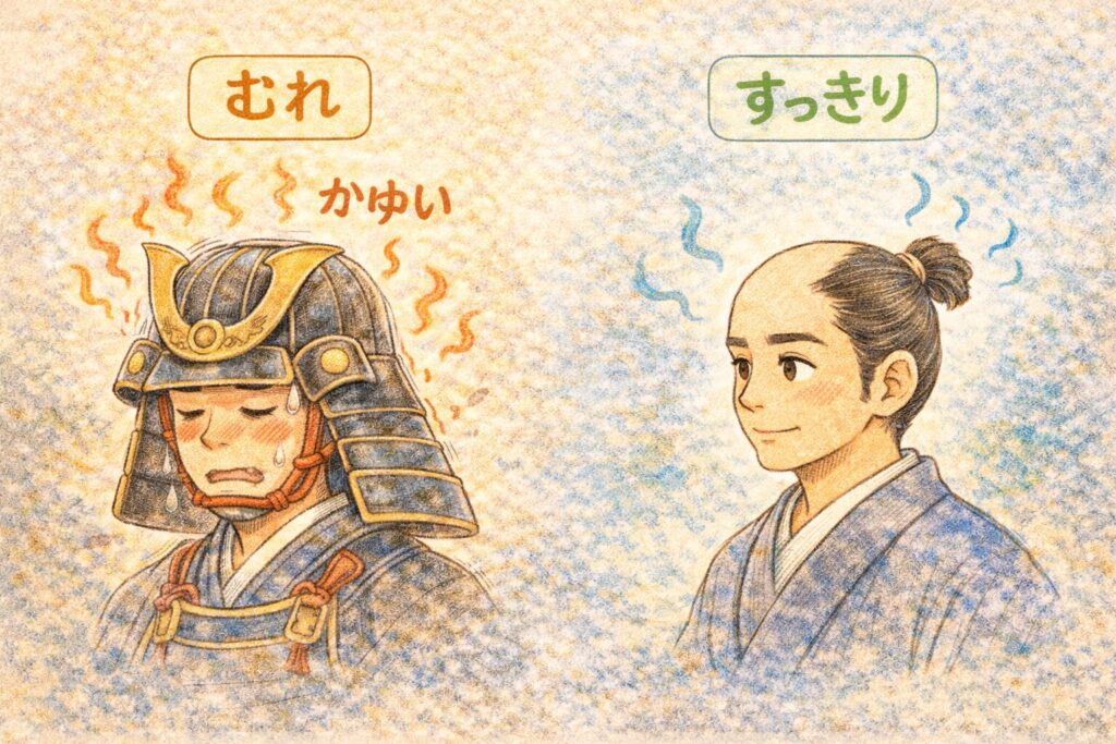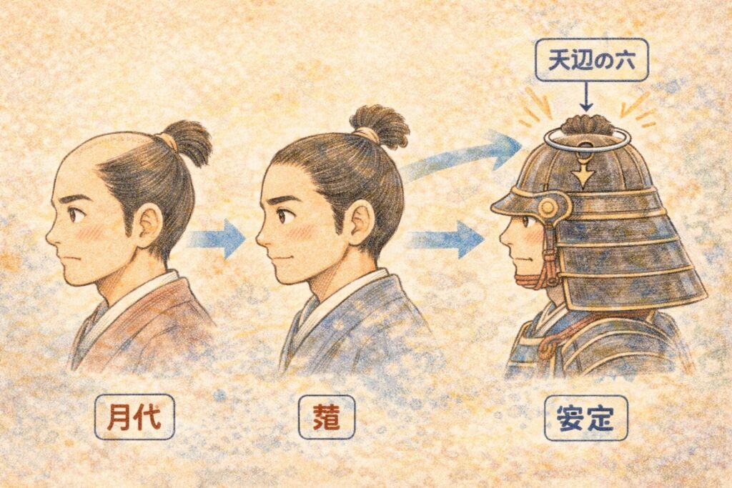 「通気性のため」とだけ書くのは少し雑で、より正確には「兜を安定させ、かぶりやすくするため」と説明したほうがよい、という整理ができます。さらに、髷・月代・ちょんまげの違いまで見えやすくなります。