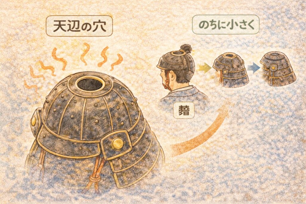 古い武士の兜にある**天辺の穴(てへんのあな)**です。