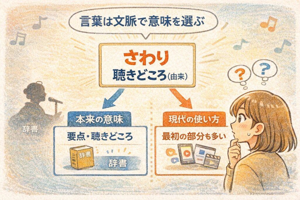 そして分かったのは、**「さわり」は本来“要点・聴かせどころ”という意味で、
