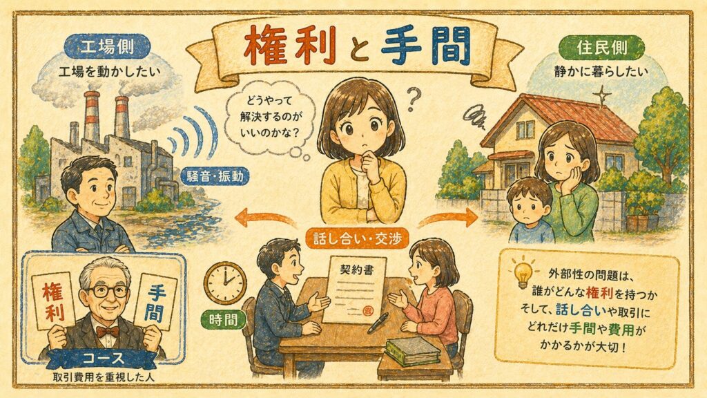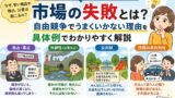この記事でいう「自由競争の限界」とは、自由な売買や競争が悪いという意味ではなく、外部性、公共財、情報の差、取引費用のように、市場だけでは解決しにくい問題があるという意味です。