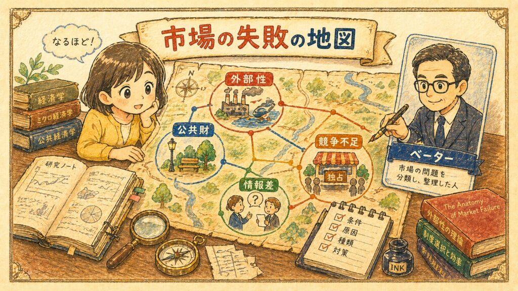 もう少し具体的にいうと、ベーターは市場の失敗を、ただ一つの問題としてではなく、いくつかの種類に分けて考えました。