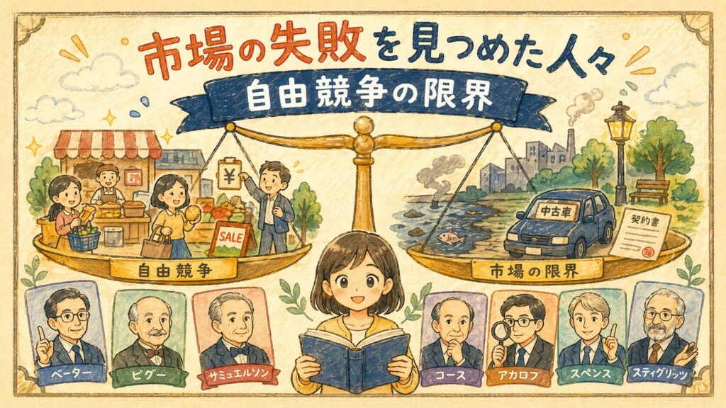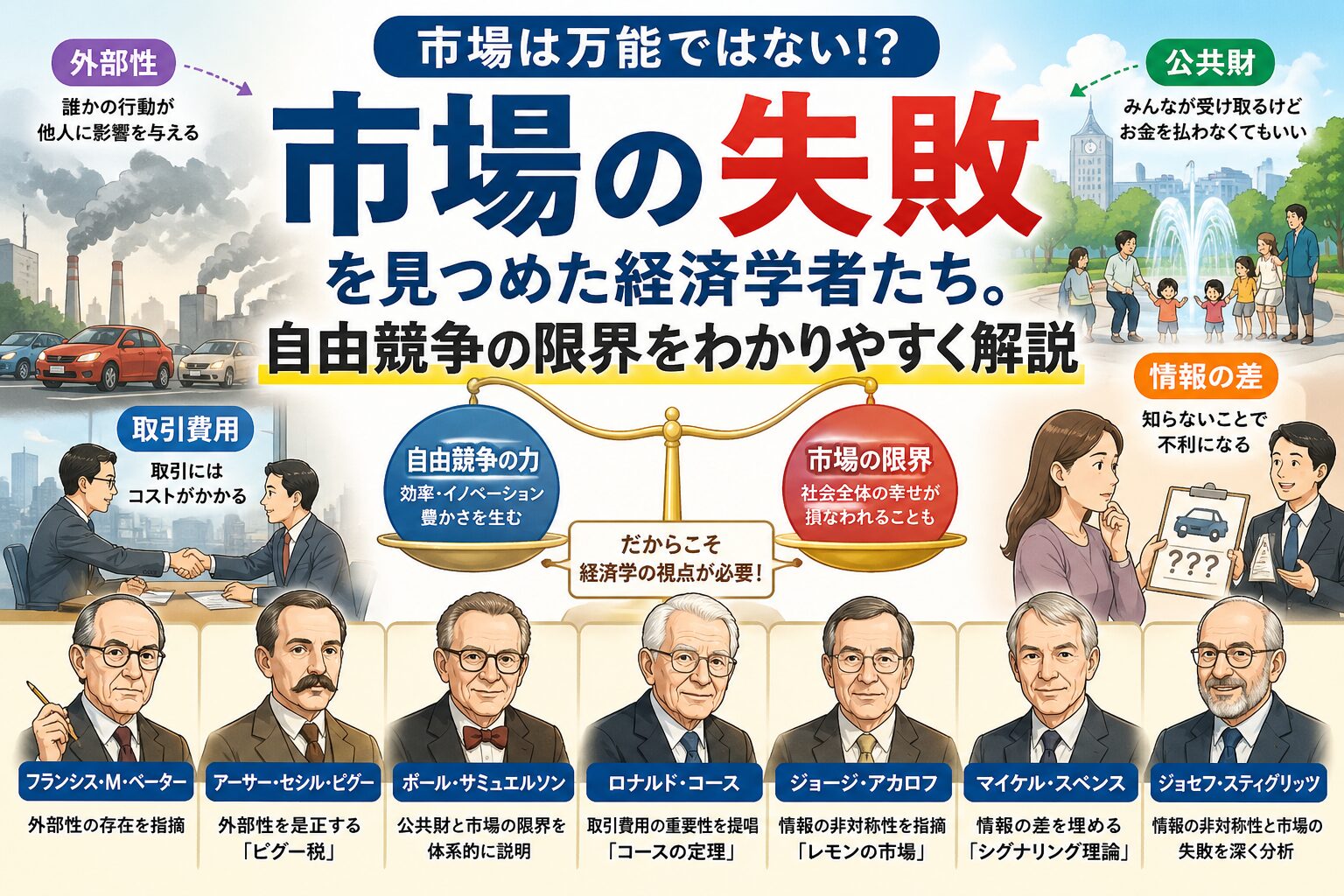 この記事では、市場の失敗という言葉や考え方に関わる経済学の偉人たちを、できるだけわかりやすく紹介します。