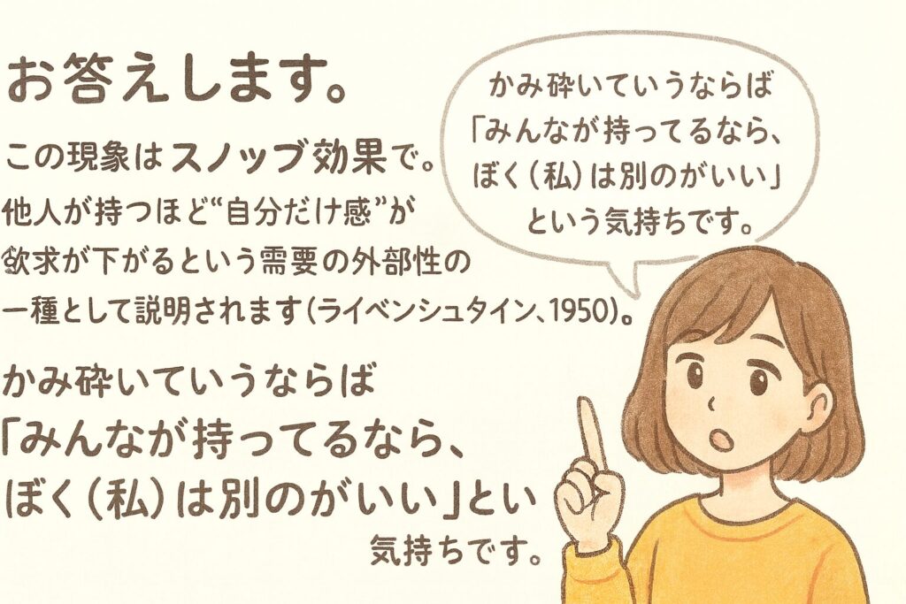 これは「スノッブ効果」——“人と同じ”になると特別感が薄れてしまう心理現象だと。