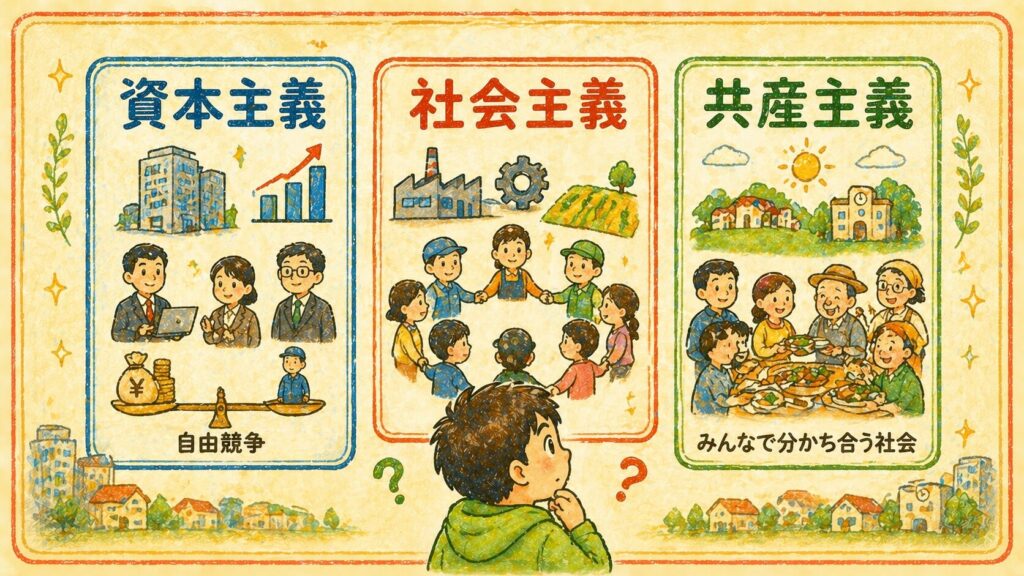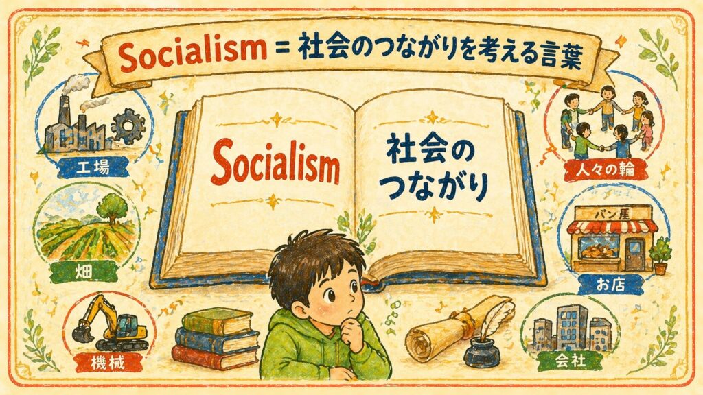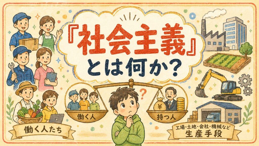 社会主義』とは、工場・土地・会社・機械など、お金や商品を生み出すための大切な資本を、一部の人だけが持つのではなく、政府や社会全体で管理し、そこから生まれた富をできるだけ公平に分けようとする考え方です。