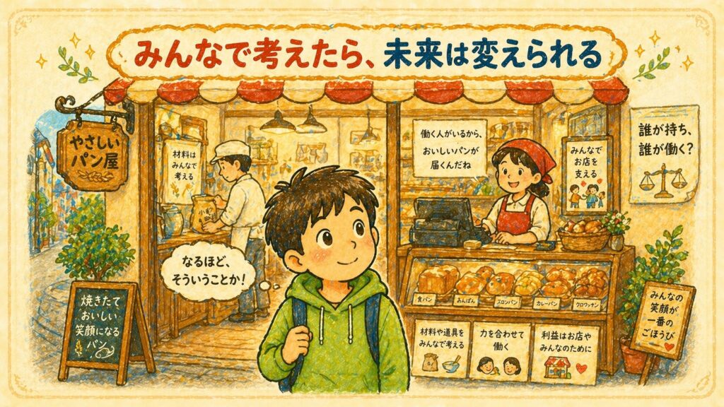 “お金を生み出す大事なものを、少数の人だけが持つと差が広がりすぎるかもしれない。だから、社会全体で管理して、みんなの暮らしに役立てよう”