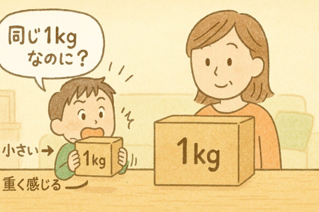 同じ重さ(同じ質量)なのに、見た目が小さいほうを“重い”と感じやすい錯覚のことです。