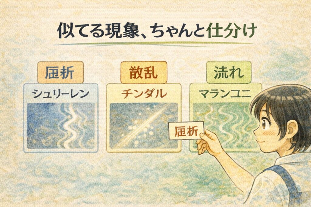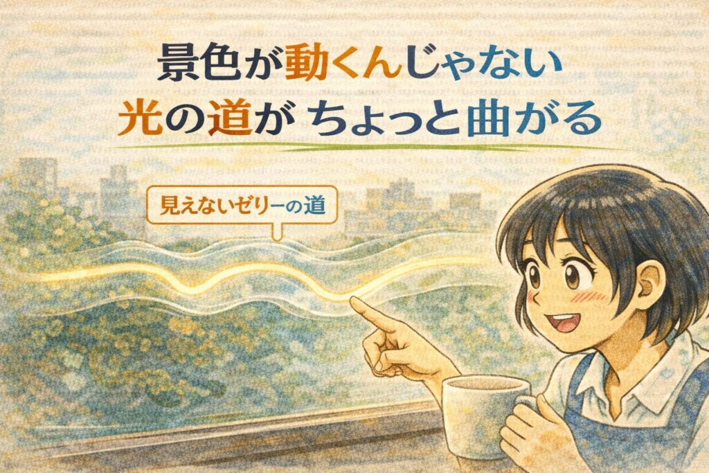 次の章では、この“光が曲がる”をもう少し丁寧にほどいて、アイスティーの線が見える流れをスッキリ説明します。
