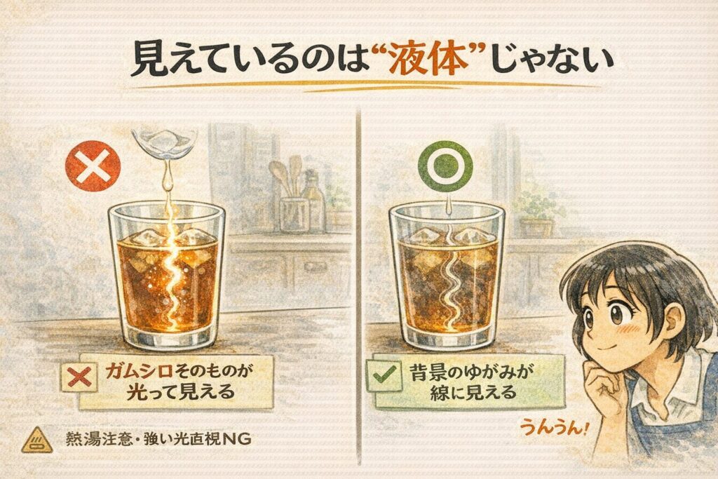 陽炎(道路の上のゆらゆら)も、アイスティーにガムシロを入れたときの透明な線も、温度差や濃度差で“密度のむら”ができ、屈折率(くっせつりつ:光の曲がりやすさ)が場所ごとに変わって光が少し曲がるために見えます。