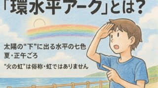 考える 真っ直ぐな虹?――『環水平アーク』(いわゆる“火の虹”は俗称・虹ではない)太陽の下に現れる水平の七色の正体と見えやすい条件(夏・正午)、彩雲との違い、スマホでの撮り方までわかるガイド 雨がないのに空に走る“水平の七色”――その正体は環水平アーク(氷晶ハロ)。本記事では、見えやすい季節と時間、彩雲・虹との明確な違い、スマホでの撮り方、安全な観察方法をやさしく解説。3秒で答え→深掘りで納得の、実践型ガイドです。 2025.10.16 考える
