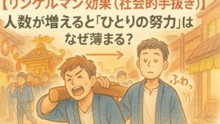 人数が増えるほど努力が薄まりやすい──リンゲルマン効果。お神輿や職場・学校で起きる“手抜き”の理由と、名指し/見える化/小集団化/目的1行で戻す実践を、物語とテンプレ、Q&A付きでわかりやすく。ケーラー効果の“引き上げ”も紹介。