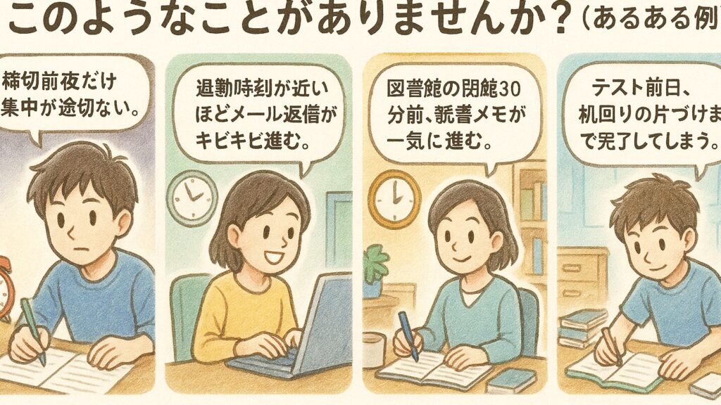 - 現代の仕事や学習はタスク過多・締切だらけ。そこで、適度なタイムプレッシャーを意図的に作ることで、着手の抵抗を減らし、集中に入るスイッチとして活用できるからです。