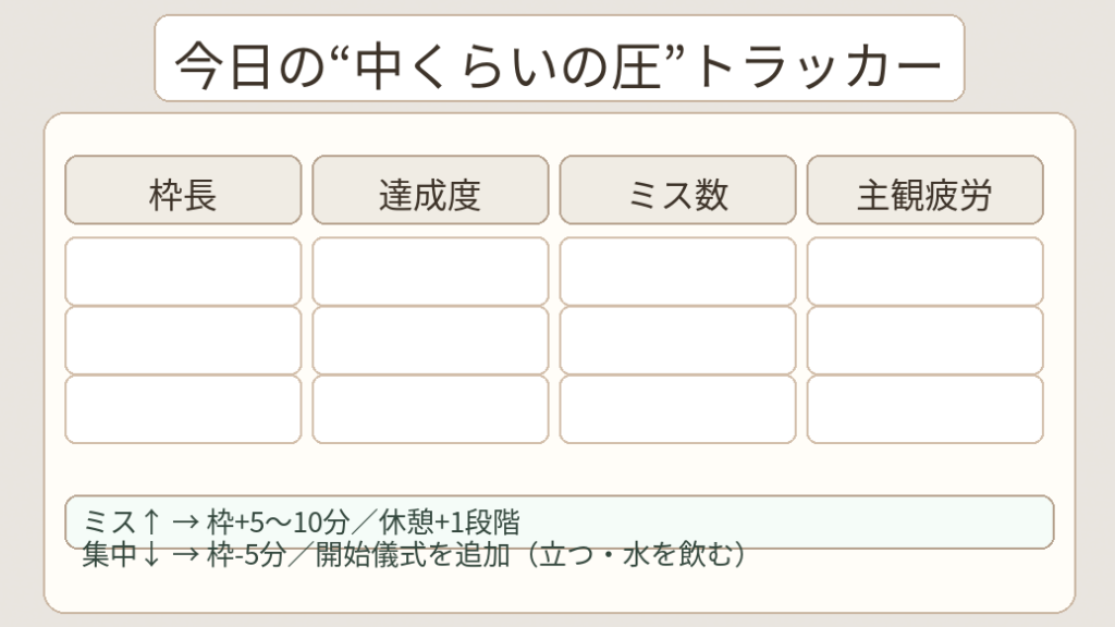 - 短い枠 × 休憩 × 見直し、セルフ締切+外部化で、先延ばしとミスを同時に抑える。