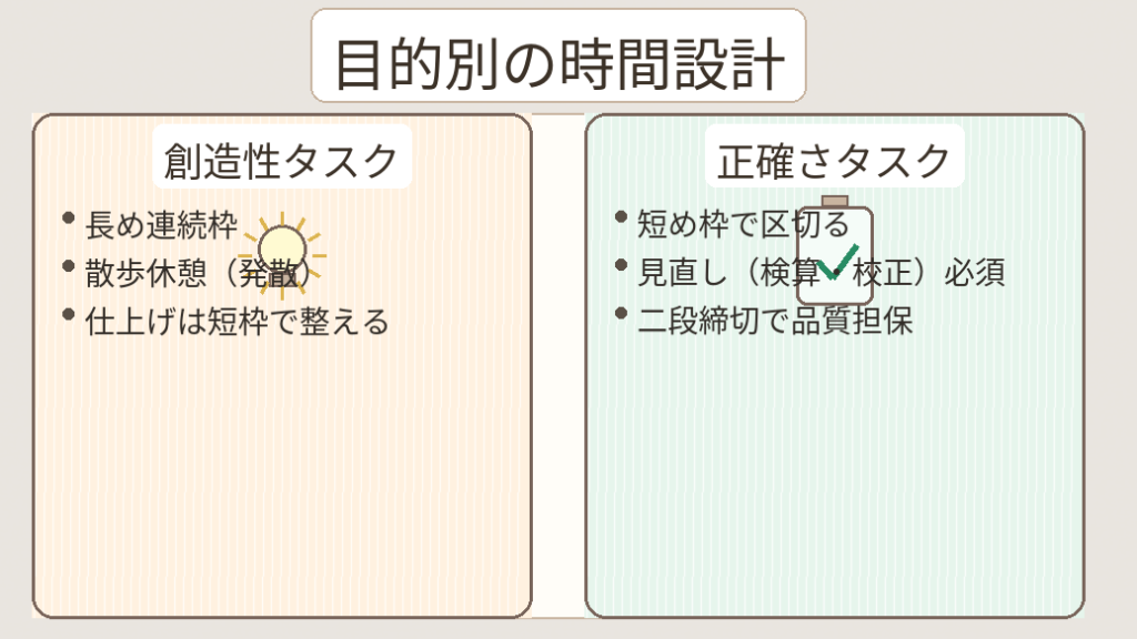 - 創造性重視(アイデア出し):長めの連続枠+休憩は散歩など発散系。