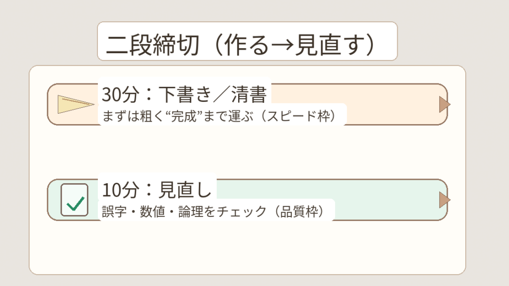 「まずは粗く書く。 それから見直す——二段締切だ。」