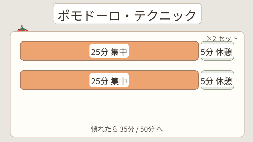 1980年代にフランチェスコ・チリロが考案した**「25分集中+5分休憩」**を1セットにする時間管理法。トマト型キッチンタイマー(伊語:pomodoro=トマト)に由来します。短い時間制限で軽いタイムプレッシャーを作り、休憩で過度な緊張を抑える設計です。