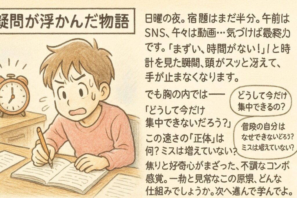 この現象は**「タイムプレッシャー(時間的圧力)」**によるものです。時間が少ないと感じることで覚醒度(ドキドキ度)が上がり、集中とスピードが一時的に高まるのです。いっぽうで、強すぎる圧力はミスを増やすため「ちょうどいい強度」に調整する必要があります。