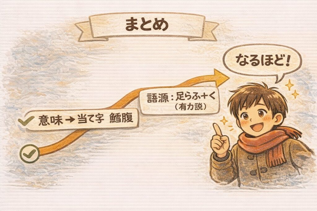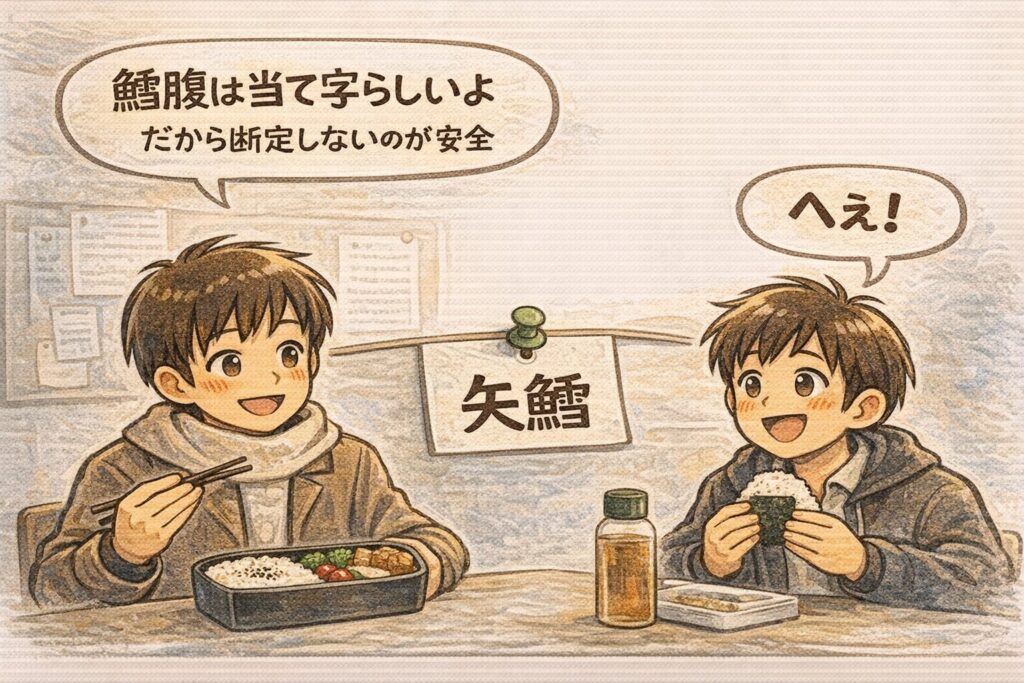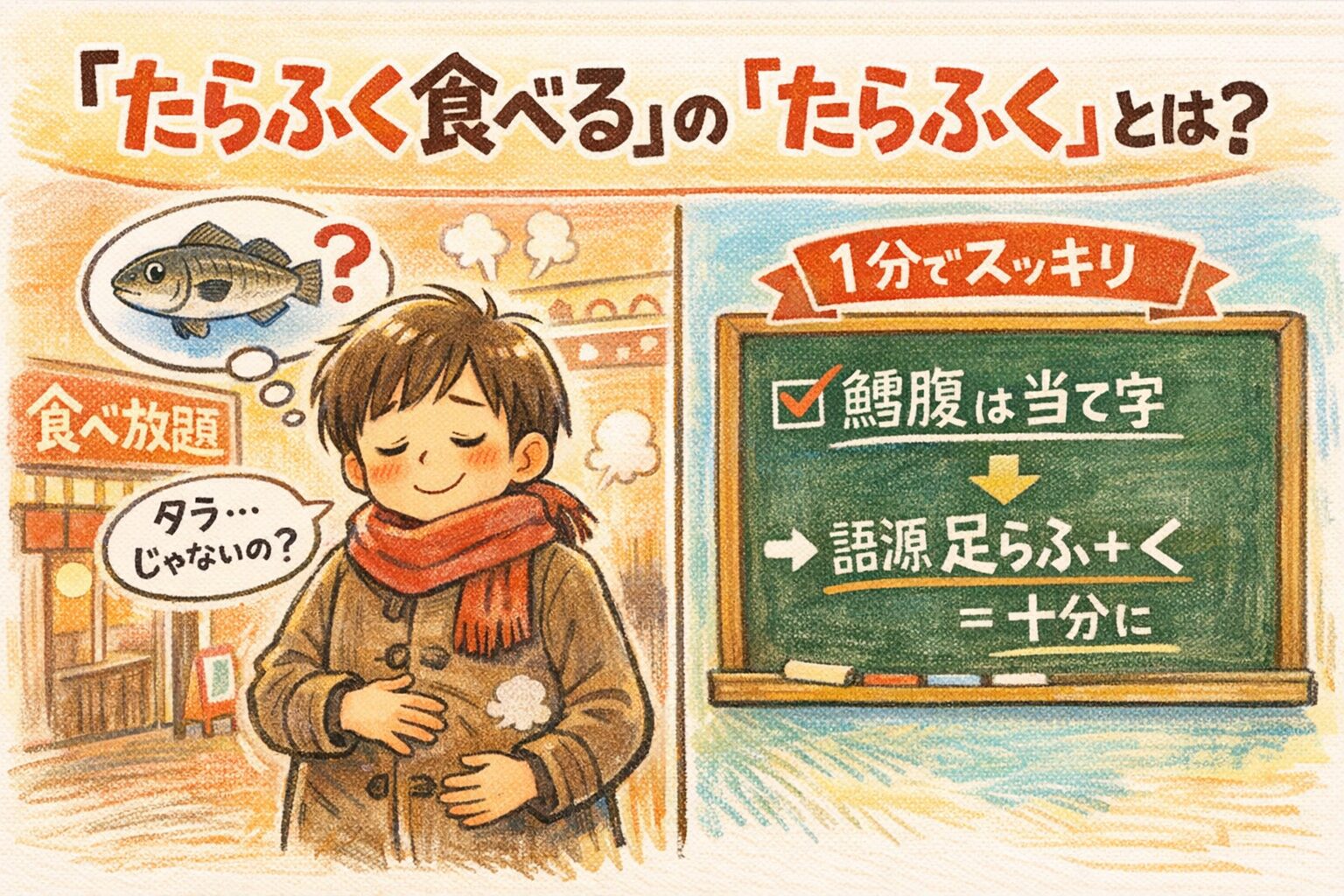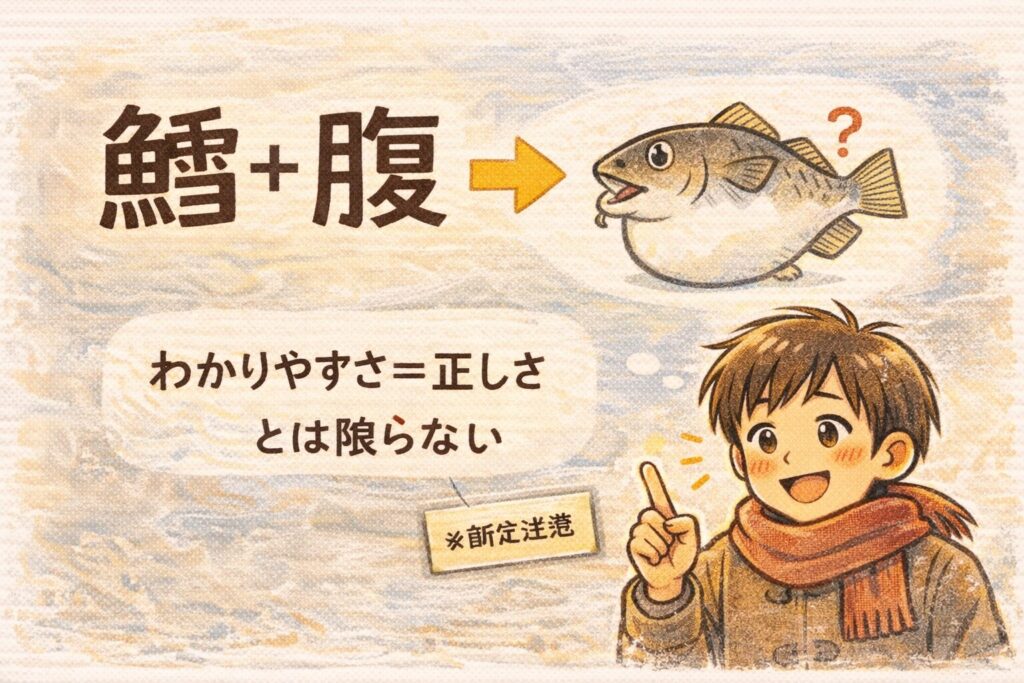 A. 「鱈腹」という字面が強く、意味の絵みたいに見えるからです。見た目でストーリーが一瞬で作れる説明ほど“正しそう”に感じやすいのが落とし穴です。