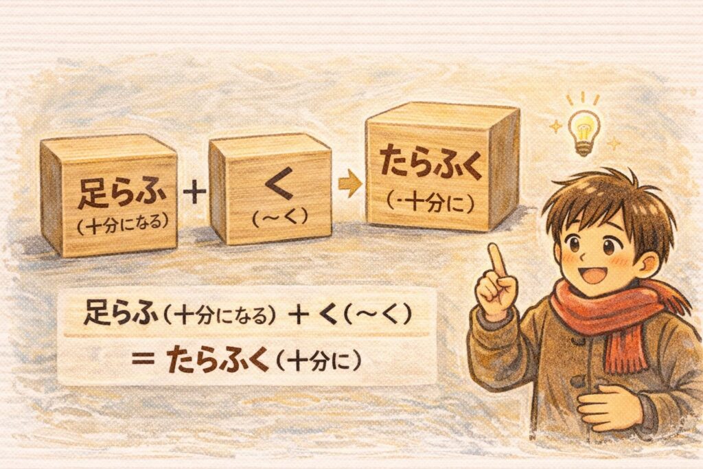 語源は、古い日本語(古語・こご:昔の日本語)の 「足らふ(たらふ=十分になる)」+副詞語尾の「く」 などの説が紹介されています。