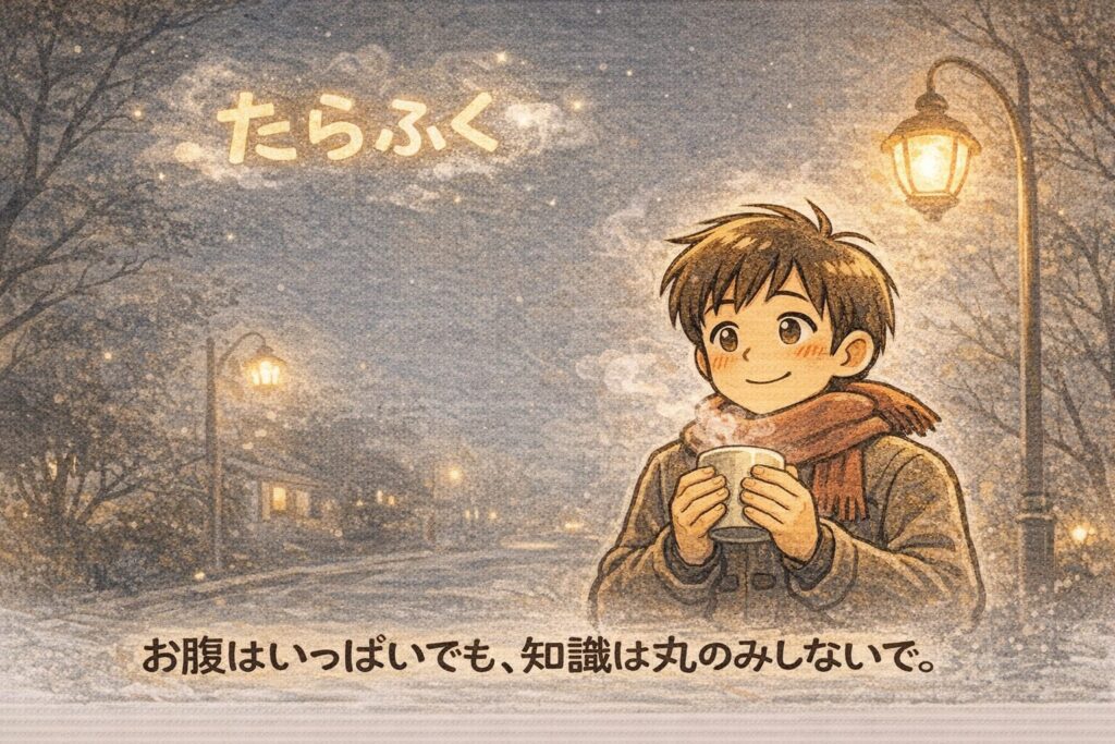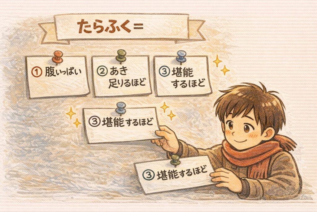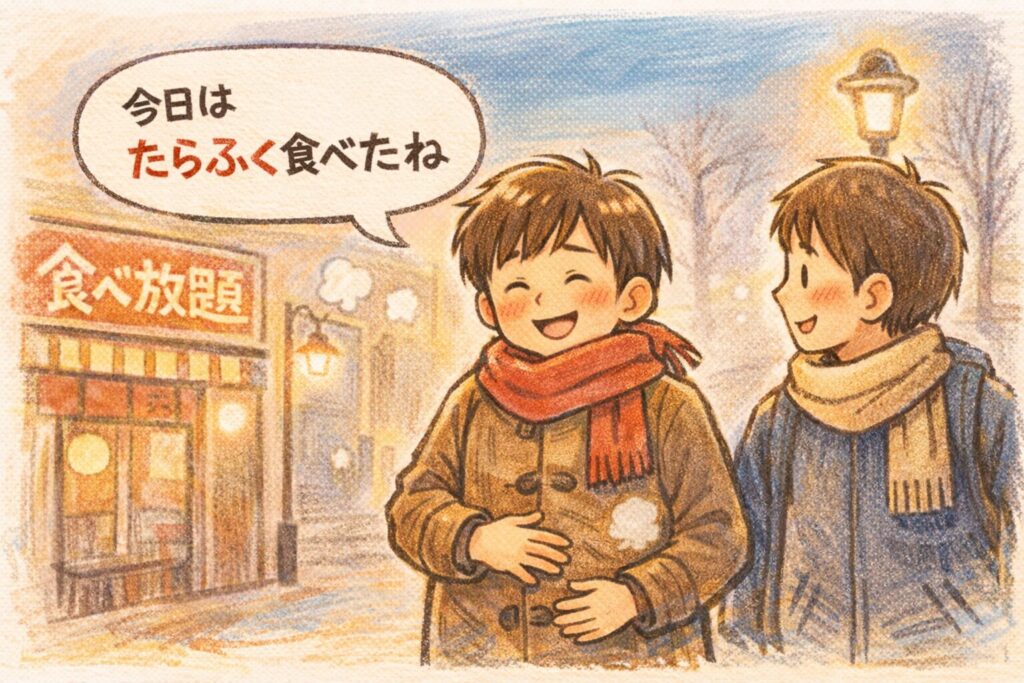 「たらふく」は、ただの“満腹”よりも、ちょっとだけ景色が浮かぶ言葉でした。