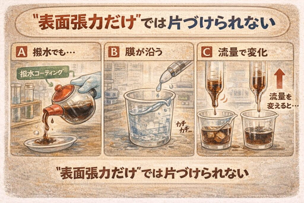 当時すでに「表面張力や付着でしょ?」と軽く片付けられがちだった…という空気感も文章から読み取れます。