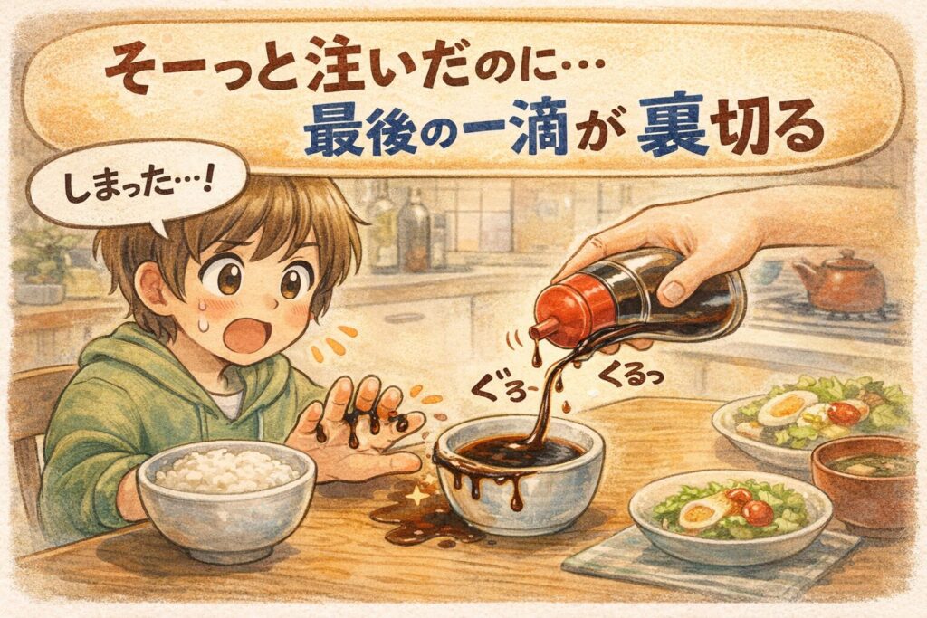 夕飯で醤油をかけようとして、そーっと注いだのに。