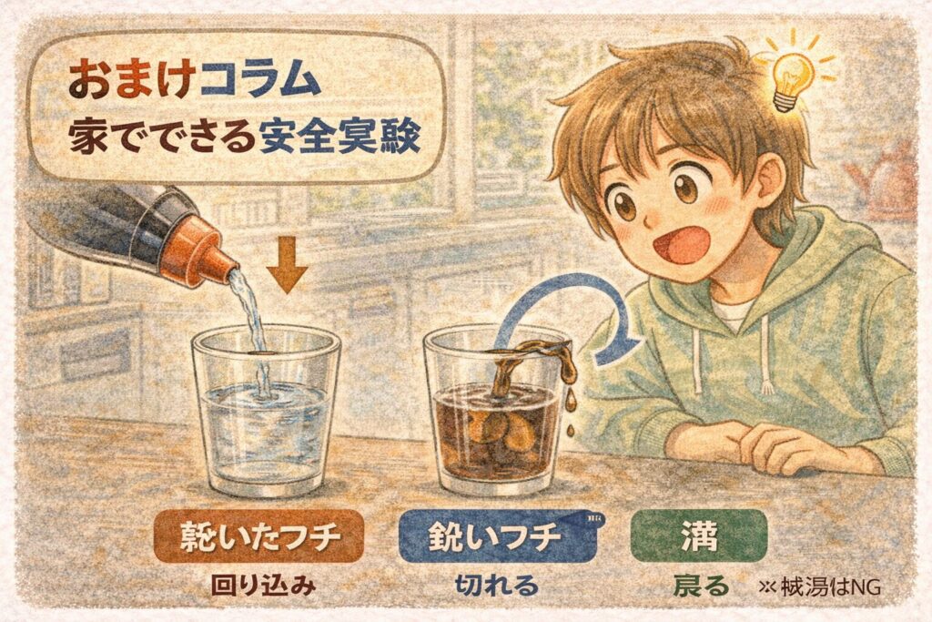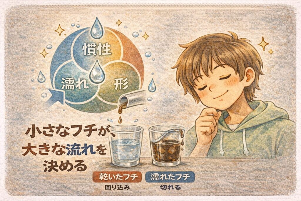 「フチが濡れてると、表面張力が味方して“くっつく力”が勝ちやすい。だから貼りつくんだ」――記事で知った言葉を、心の中で復唱しました。