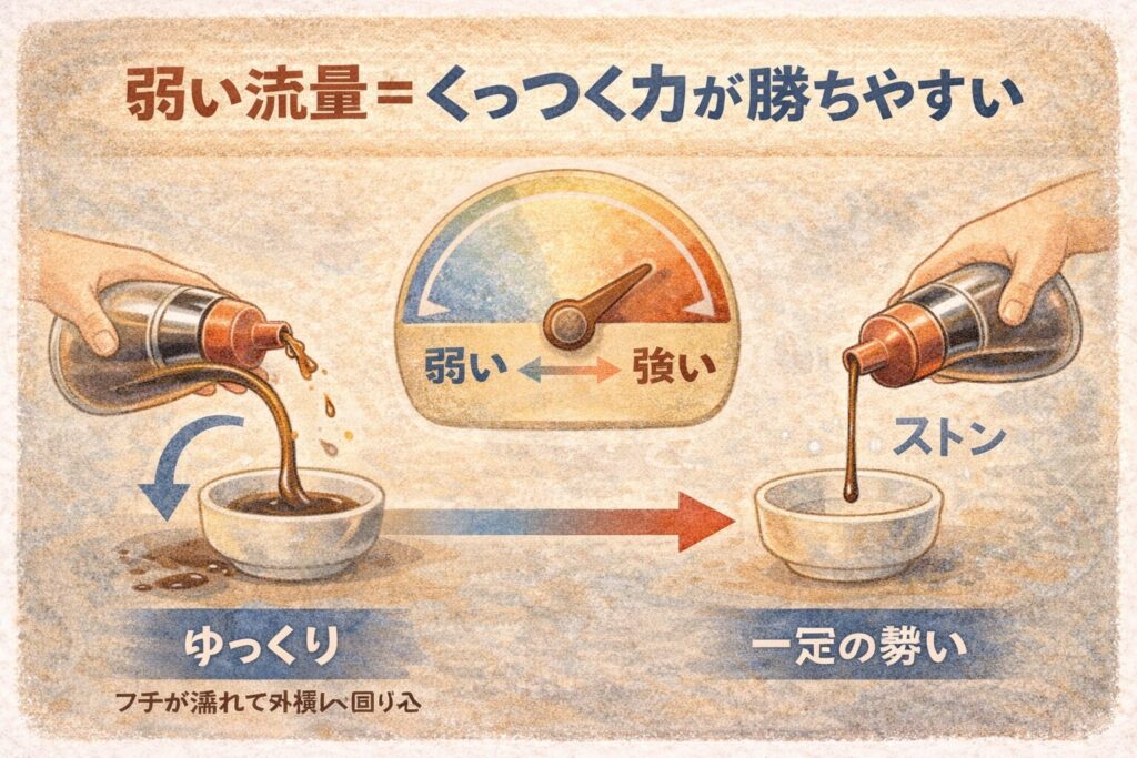 注ぐ勢い(慣性)が弱いと、注ぎ口が濡れていることで表面張力(毛細管力)が液体をフチに引っぱり、流れが器から離れずに下側へ回り込んで“液だれ”します。
