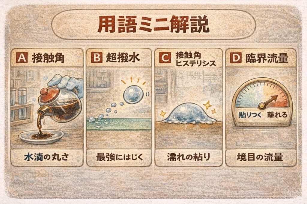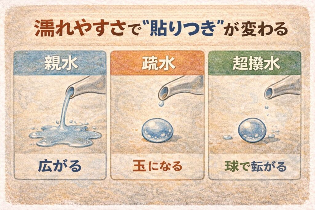 - 接触角(せっしょくかく):水滴の「丸さ」。小さい=濡れやすい/大きい=濡れにくい
