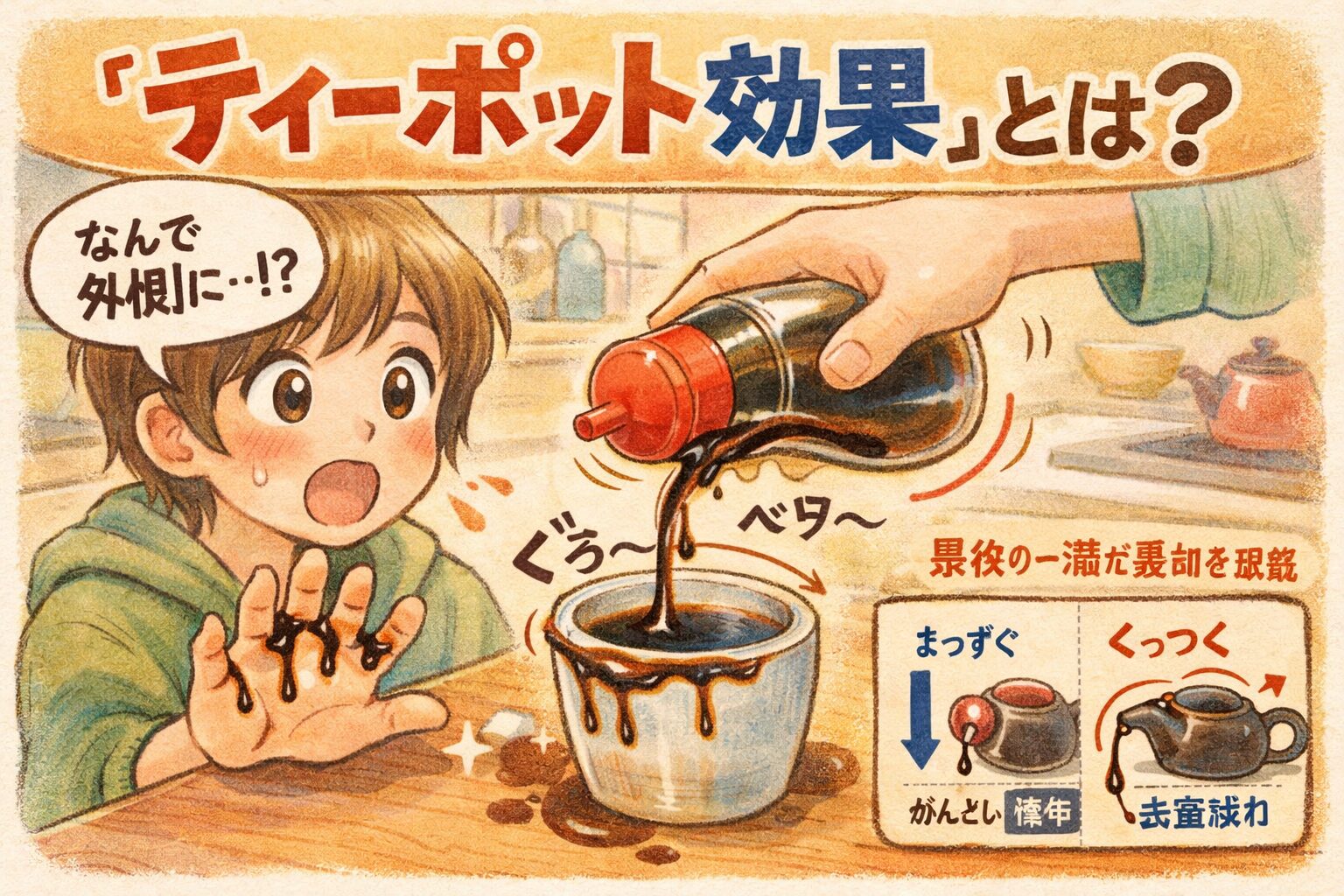 その“外側をつたってこぼれる”正体は、『ティーポット効果』です。