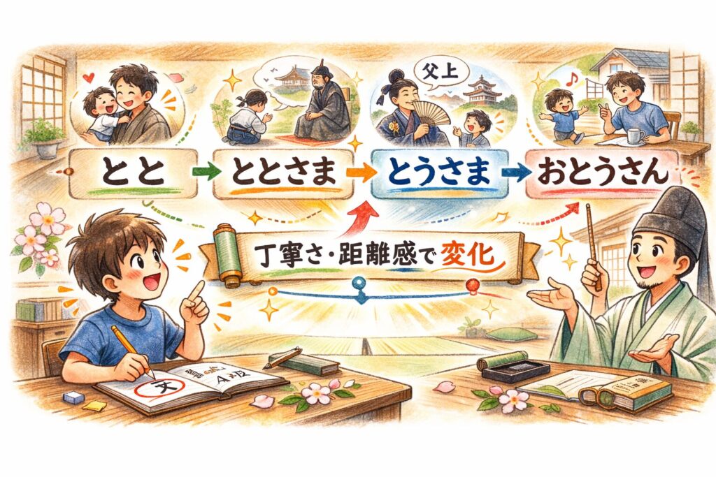 「ちち」は、呼びかけの距離で「とと」になり、やがて「おとうさん」にもなる。