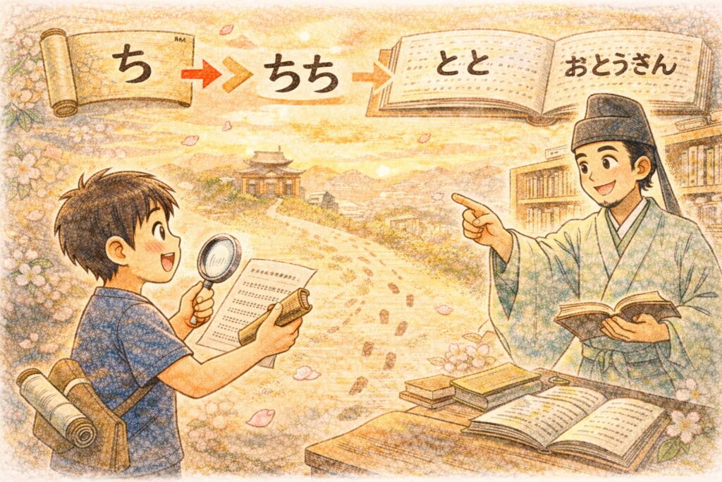 「ちち(父)」をたどるように、もっと深い文献や資料まで足を伸ばしてみてください。